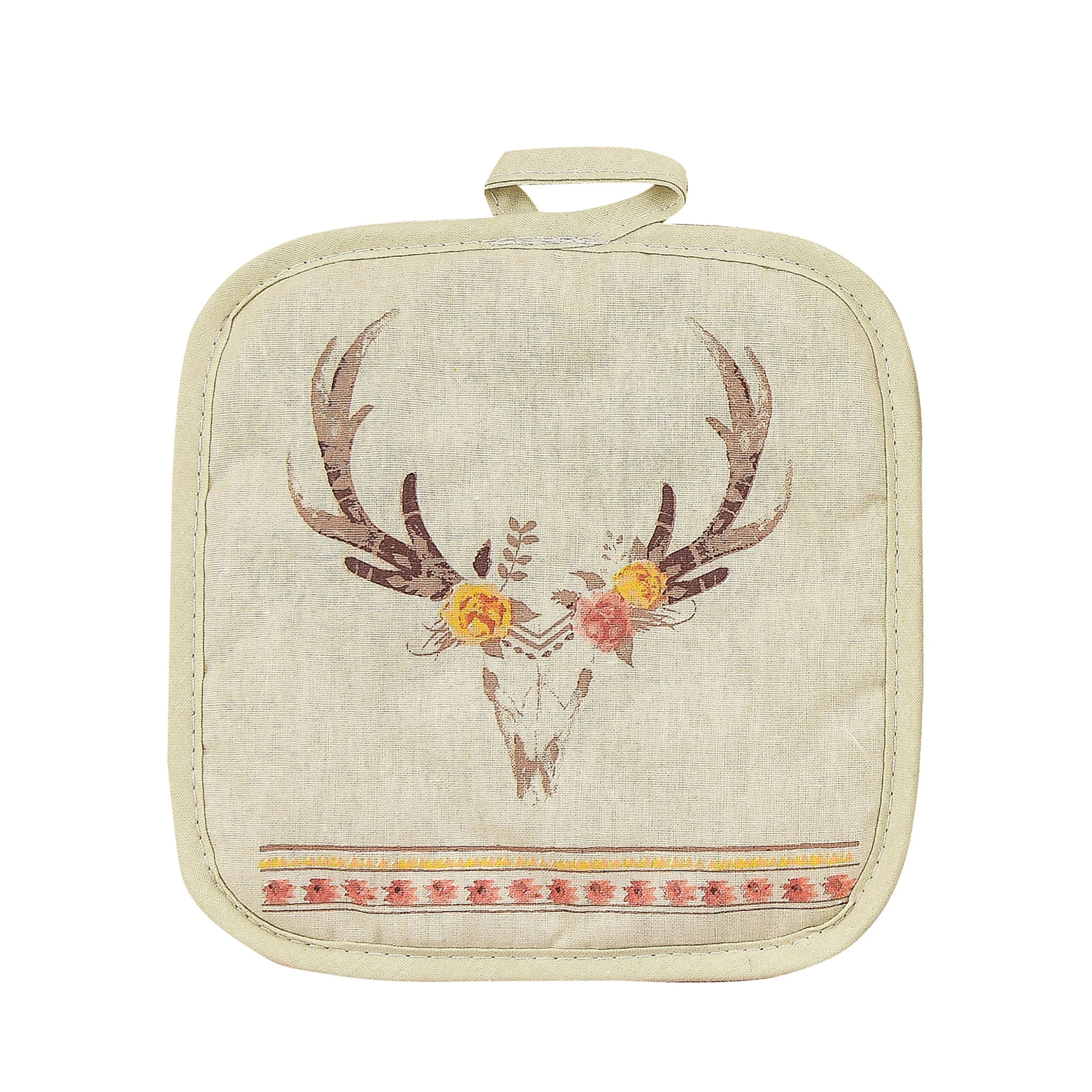This lovely Desert Skull with Flowers pot holder paired with our Desert Skull oven mitt will showcase your love of the Southwest and brighten up any kitchen!What’s Included1 Oven MittMaterialShell: 100% cotton; Filling: 100% polyesterCareMachine wash cold, gentle cycle. Tumble dry low