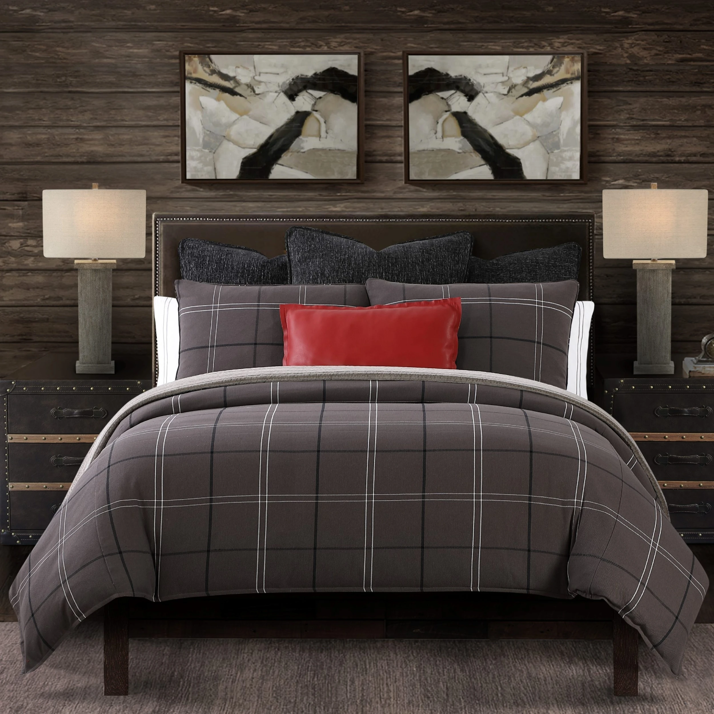The handsome striking comforter set in rich graphite with black and white plaid detail is the sophistication any master bedroom would welcome. Clean and detailed standing alone or with a pop of color this creates an inviting and sleek vibe.