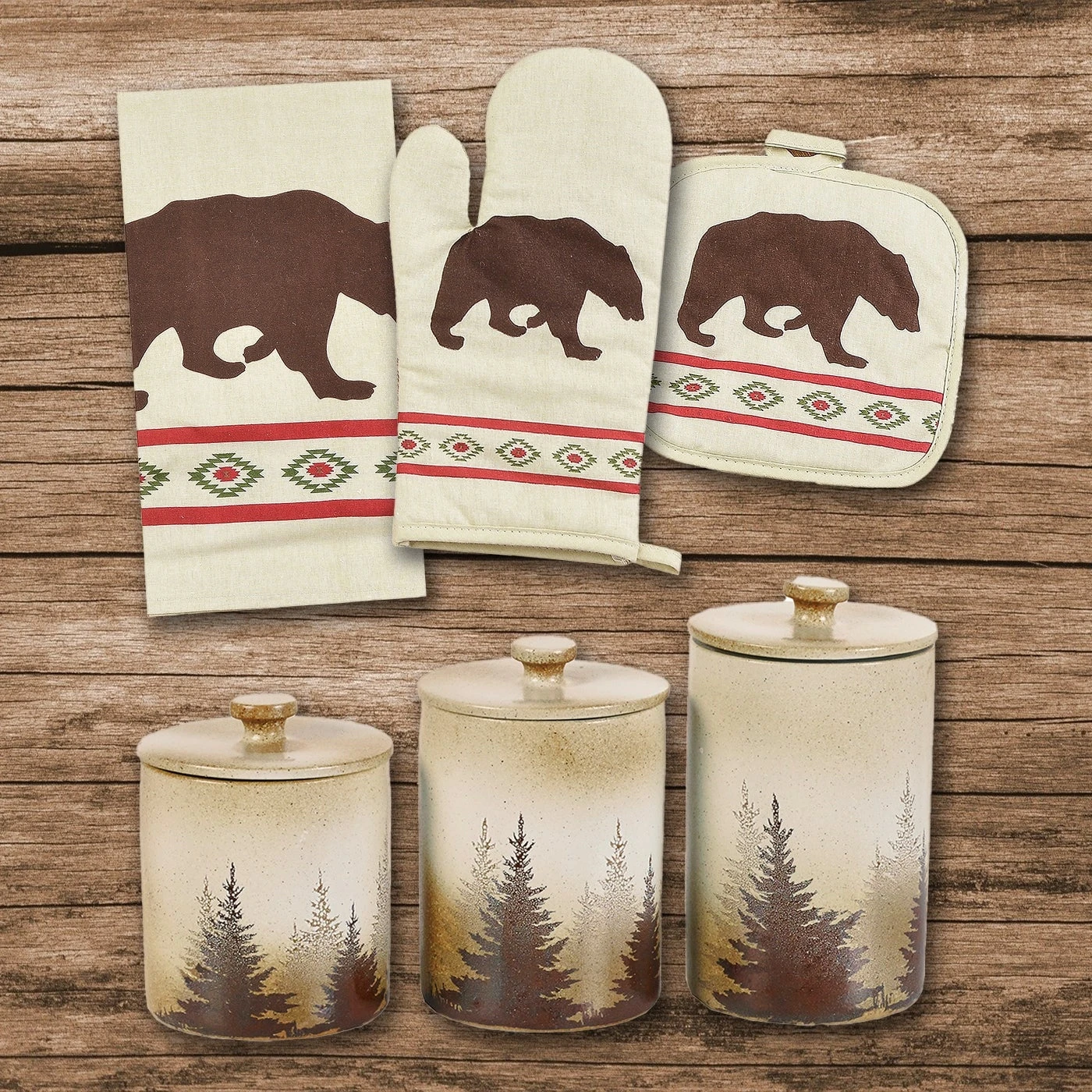 Deck out your kitchen with a fresh take on rustic with this grizzly kitchen set. Combining bear and pines inspired favorites, it adds a cozy feel to any kitchen setting. Warm up your space with rich shades of brown and cream, and add a homey look with a full set of accessories sure to capture the lodge lifestyle. For a rustic home, this set combines our Clearwater Canister Set and Aztec Bear, Big Bear, cloth accessorizes: tea towel, oven mitts, and potholders. Imported. Includes: (12) Pieces: (3) canisters, (2) oven mitts, (2) pot holders, (6) tea towels Color: Cream, Brown Care: Canisters: Dishwasher safe, for best results hand wash lids. Cloth Accessories: Machine wash cold, gentle cycle. Only non-chlorine bleach when needed. Tumble dry low. Iron on lowest setting if needed. Material: Ceramic canisters; 100% cotton tea towels; 100% cotton facing, 100% polyester filling oven mitts and pot holders Items featured in our collections can be purchased separately.