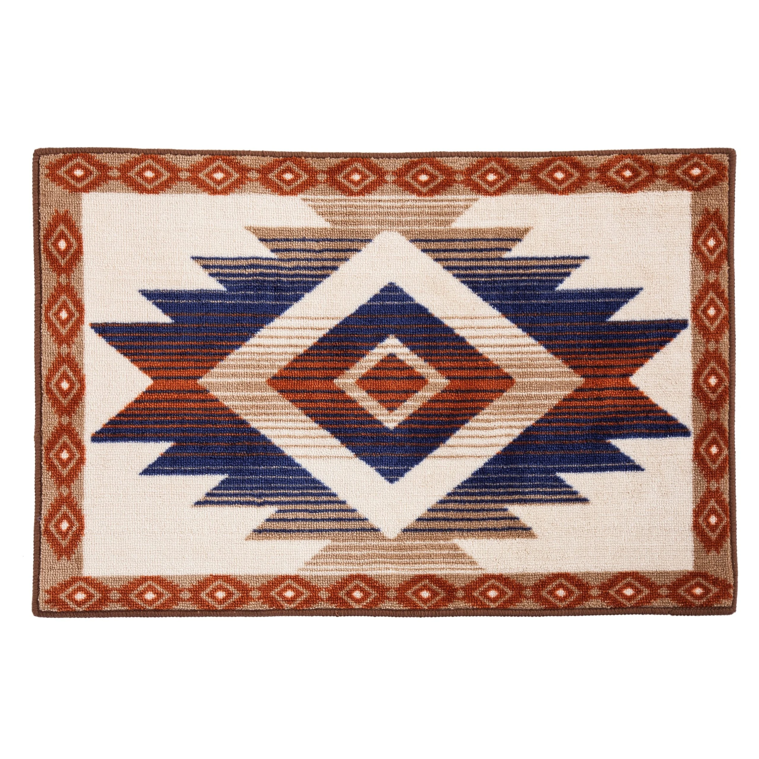This striking Aztec Inspired rug will make a statement in any room. Rich shades of blue, terra cotta, beige and tans work together to create this visually stunning rug. Measures 24″x36″. Made from 100% premium acrylic with a latex backing. Machine wash for easy care. Imported.