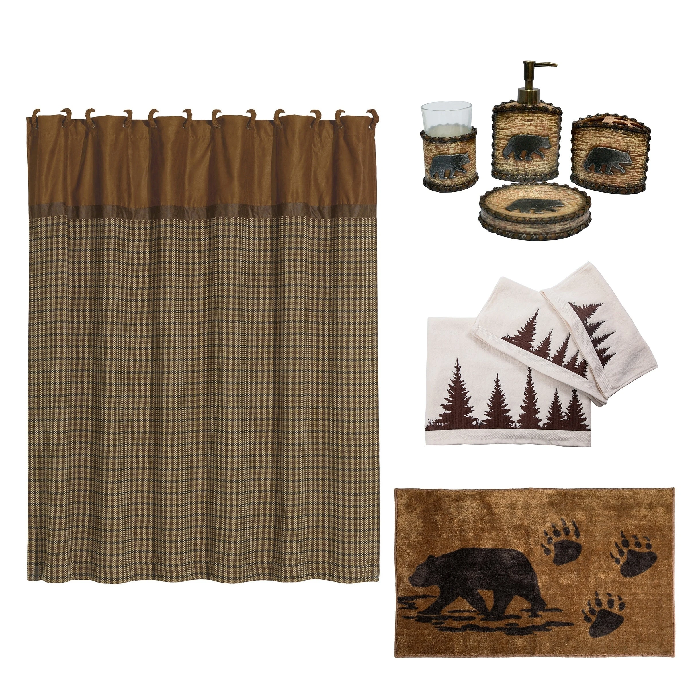 The Bear Bath Collection makes decorating your bathroom a snap. Includes everything you need. The 21-Piece Bear Bath Collection consists of: (1) Houndstooth and Faux Suede Shower Curtain, (12) Fabric Covered Shower Curtain Rings, (3) Piece Embroidered Tree Towel Set, (4) Piece Bear Bath Accessories Set and (1) Bear Bath Rug. Measurements: Shower Curatin 72″x72″; Towel Set: Bath Towel: 27″ X 52″, Hand Towel: 16″ X 32″, Finger Towel: 13″ X 14″; Bath Accessory Set: Toothbrush Holder: 4.75″x 3.12″x 4.25″, Lotion Dispenser: 4.25″x 3.12″x 8″, Soap Dish: 5.25″x 4″x 1.125″, Tumber: 3.25″x 3.25″x 3″; Bath Rug 24″x36″. Materials: Shower Curtain 100% Polyester; Towel Set: 100% Cotton; Bath Accessory Set: Resin; Bath Rug: 100% acrylic, latex backing. Care: Shower Curtain: Dry Clean; Towel Set and Bath Rug: Machine wash. Imported.
