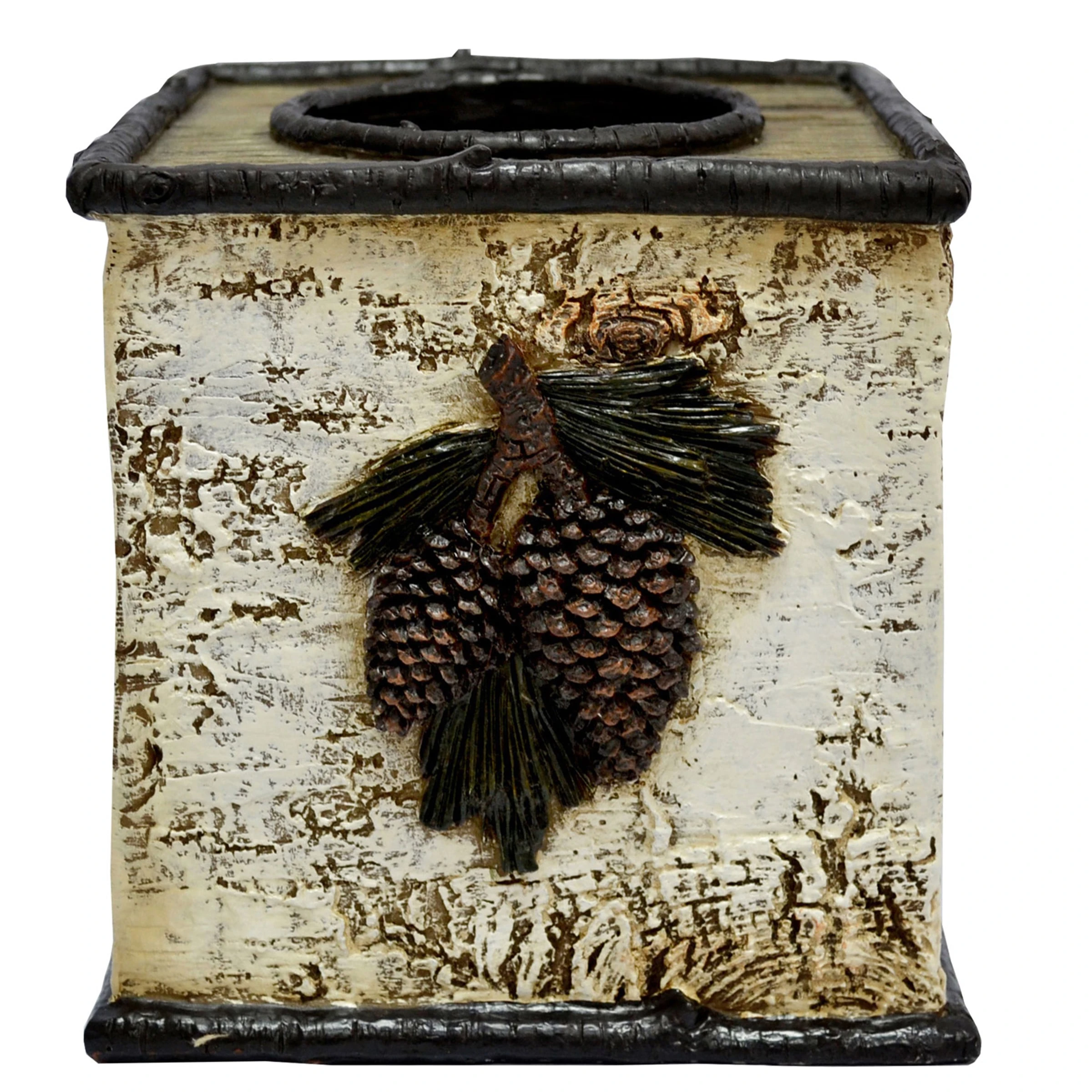 Turn that dowdy tissue box into an elegant addition to a guest bathroom with this Birch pinecone tissue box. Featuring an antique, distressed white finish, 3D pinecone, and black outline, the box offers a classic look that complements your current color scheme. The bottom of the box is wide-open, making it easy to place over a standard packaged tissue box.