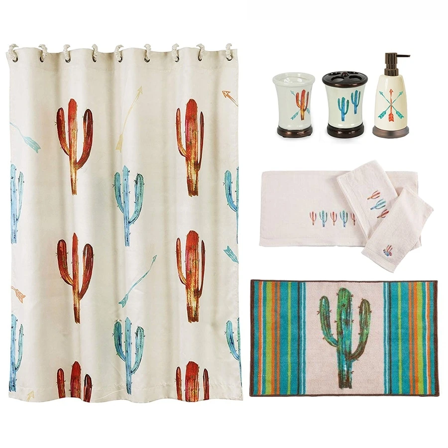 Add a southwestern flair to your bathroom with a cohesive collection set. This Colorful Cactus bathroom set provides you with matching accessories that pull any bathroom together. Collection includes: Cactus Shower Curtain & Rings, 72″x72″ 3 PC Cactus Bath Set 3 PC Embroidered Cactus Towel Set, Cream Cactus Rug, 24″x36″