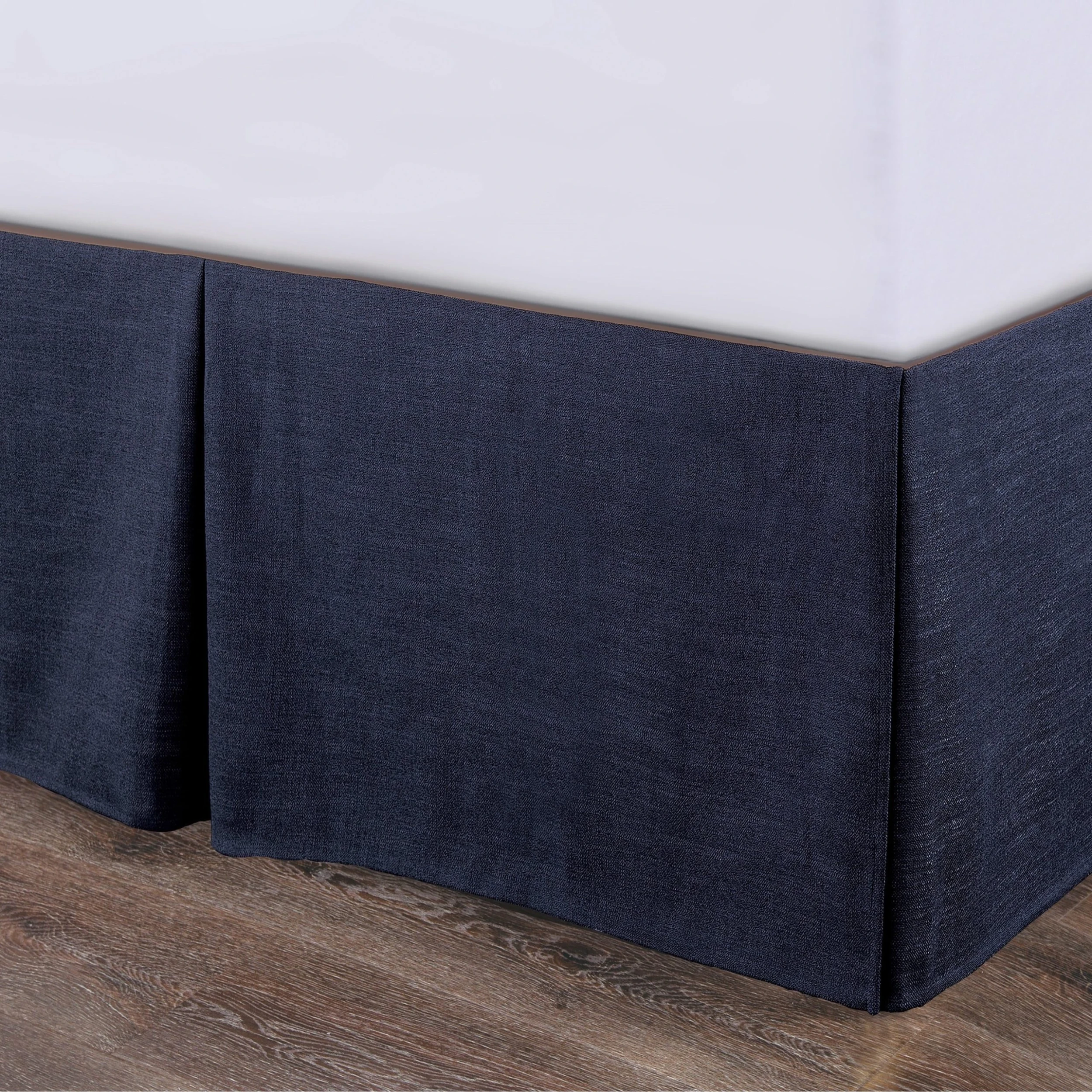 This transitional navy bed skirt adds interest with its textured fabric. It can layer in nicely with transitional or western collections. MaterialSkirt: 80% polyester, 20% viscose; Decking: 100% polyesterDimensionsKing – 78″x80+18″Queen – 60″x80″+18″CareDry clean recommended