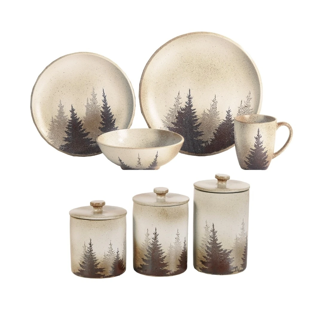 Shadowy pine tree silhouettes on cream speckled stoneware evoke a wintry forest feeling for your table. Coordinating pieces bring a cohesive, singular, fashionable charm unlike any other, as subdued hues offer the perfect pop of elegance.