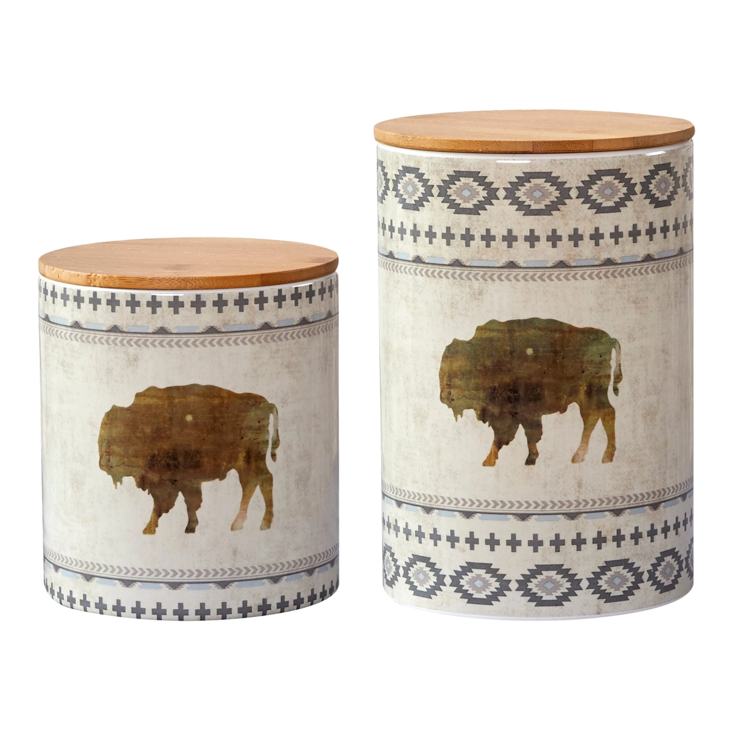 Store food and more while enhancing the look of your kitchen with this set of two lovely ceramic canisters. Decorated with buffalo patterns and Aztec motifs, these canisters have a distinct southwestern flair. The bamboo lids have silicone gaskets that create a tight seal to keep food fresh.