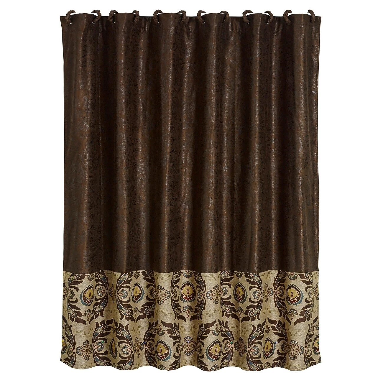 Lovely chocolate faux tooled leather shower curtain features a panel of Loretta fabric at the bottom. Includes 12 coordinating fabric covered shower curtain rings. Measures 72″ X 72″. Dry clean recommended. 100% polyester. Imported.