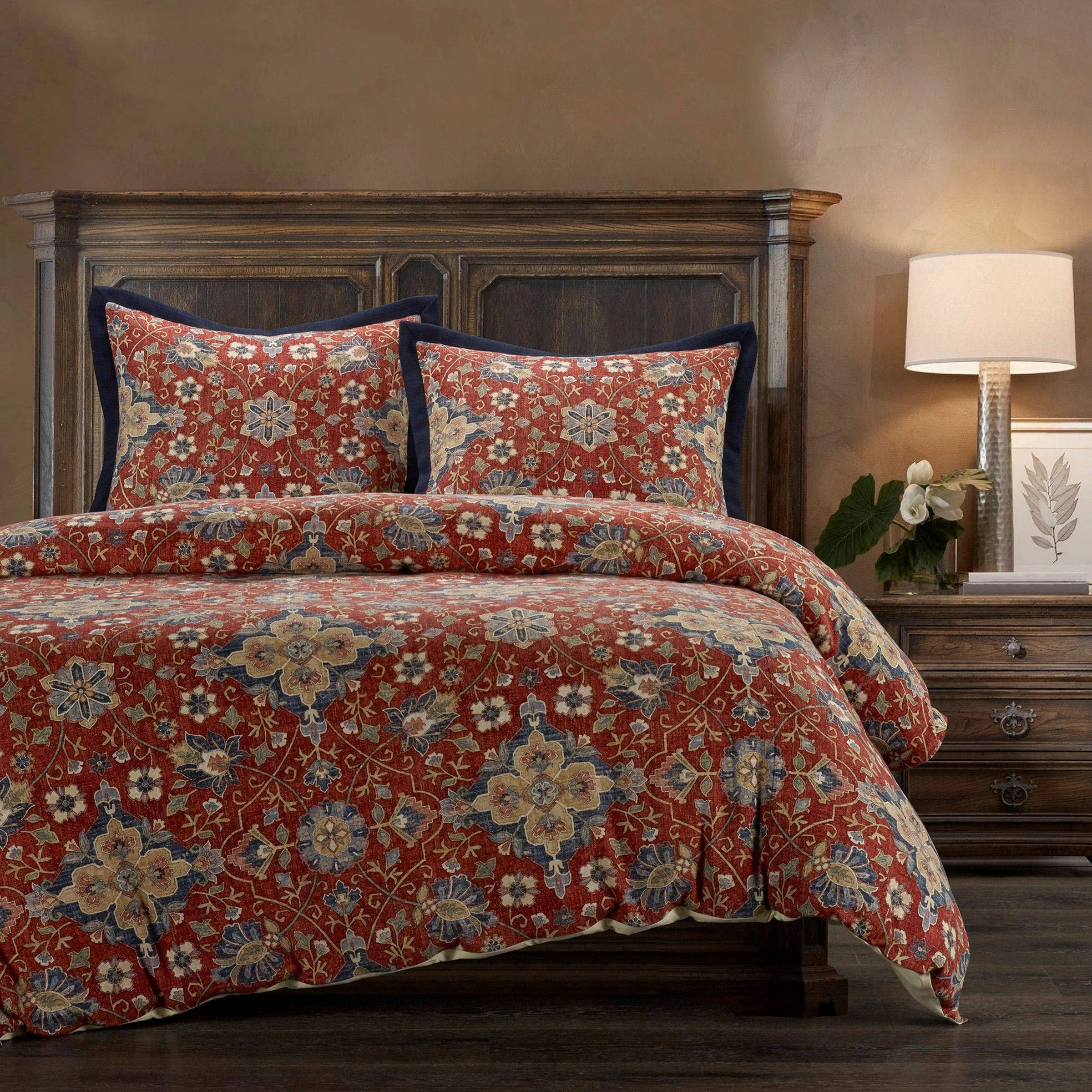 Melinda exudes Old World elegance with a Western twist, owing to its vivid floral medallions and lush palette. Rich shades of rustic red, navy, cream, sage green, and tan effortlessly draws your eyes, while the distressed medallion print imparts a vintage charm. Our washed linen blend maintains the textural appeal and breathability of linen while being soft, wrinkle-resistant, and easy to care for.