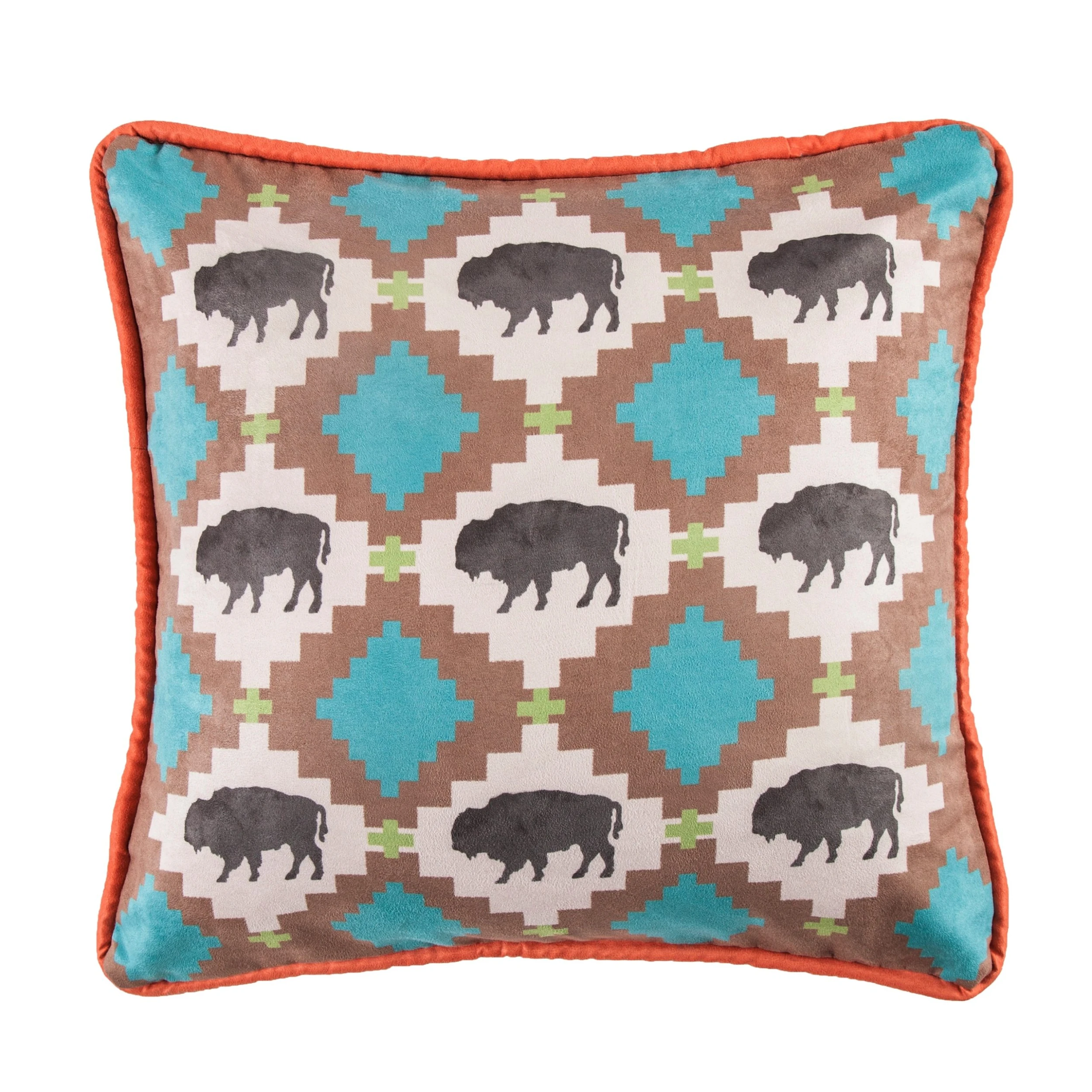 This colorful square reversible buffalo pillow will add a decorative touch to any room. Aztec inspired geometric designs in turquoise, chartreuse, tan and mocha create the perfect background for the nine buffalos to roam. Reverses to multi-diamonds in turquoise, and accent crosses in orange and chartreuse. Measures 18″x18″. Shell: 100% Polyester. Filling: 100% Waterfowl Feathers. Hidden zipper closure. Spot clean recommended. Imported.
