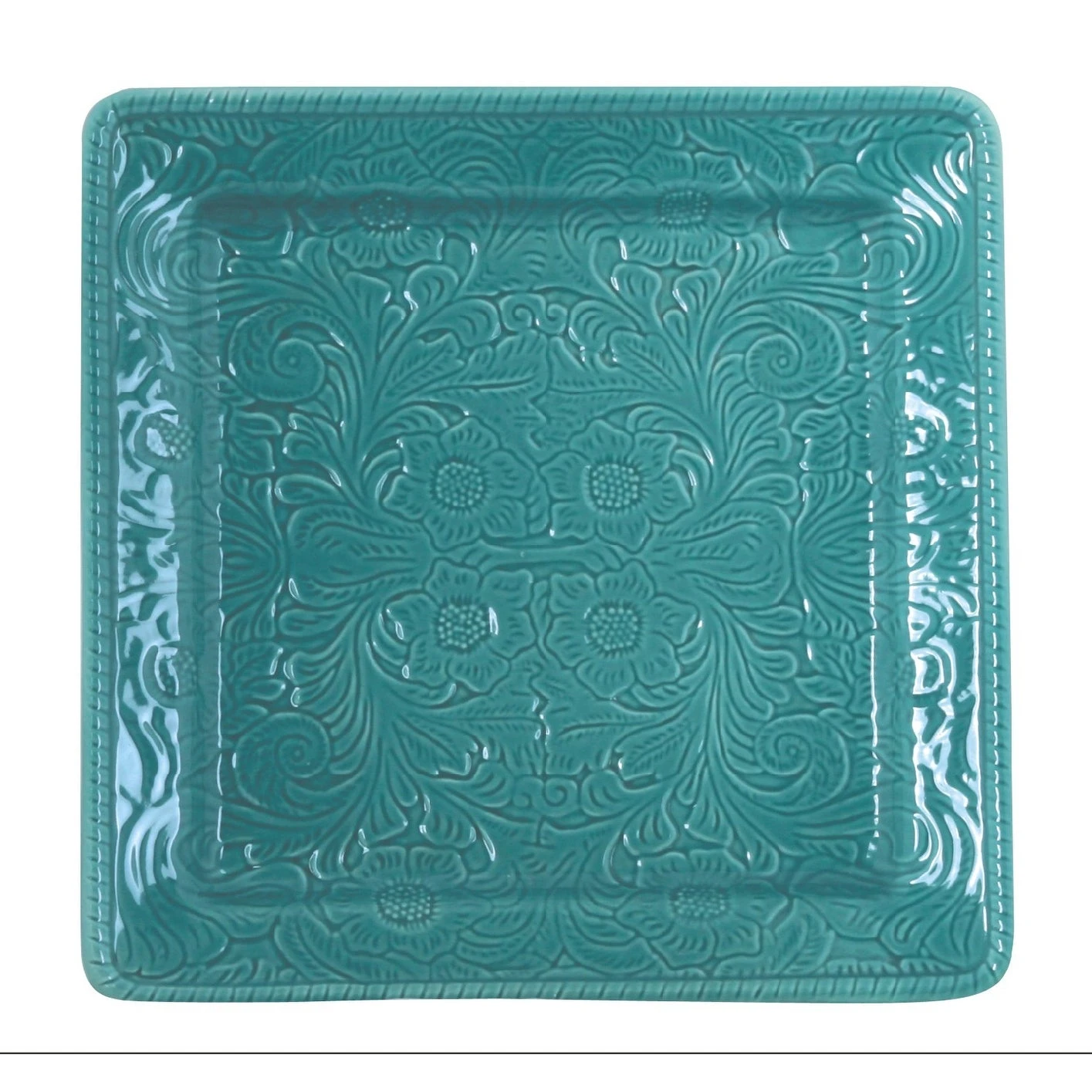 Add a graceful touch to your dining table with our damask-inspired Savannah Ceramic Serving Platter. Echoing a tooled leather design, this piece showcases embossed floral patterns on durable ceramic and is embellished with roped rim detailing for added texture and a sophisticated decorative flair. Available in soft neutrals of cream and taupe and rich shades of red and turquoise. Complete a refined lodge, Western, or modern rustic home when you complement with other Savannah home décor and dinnerware.
