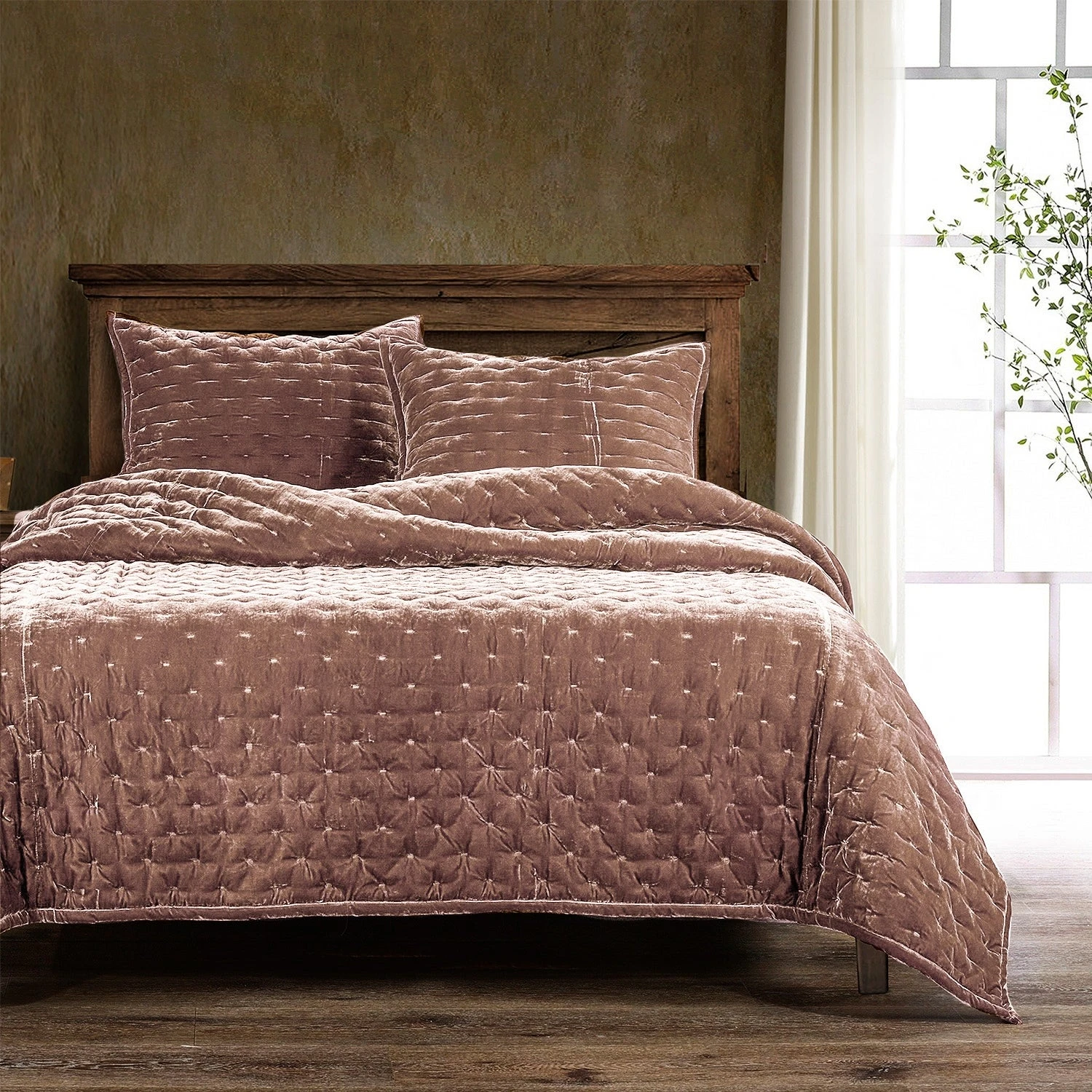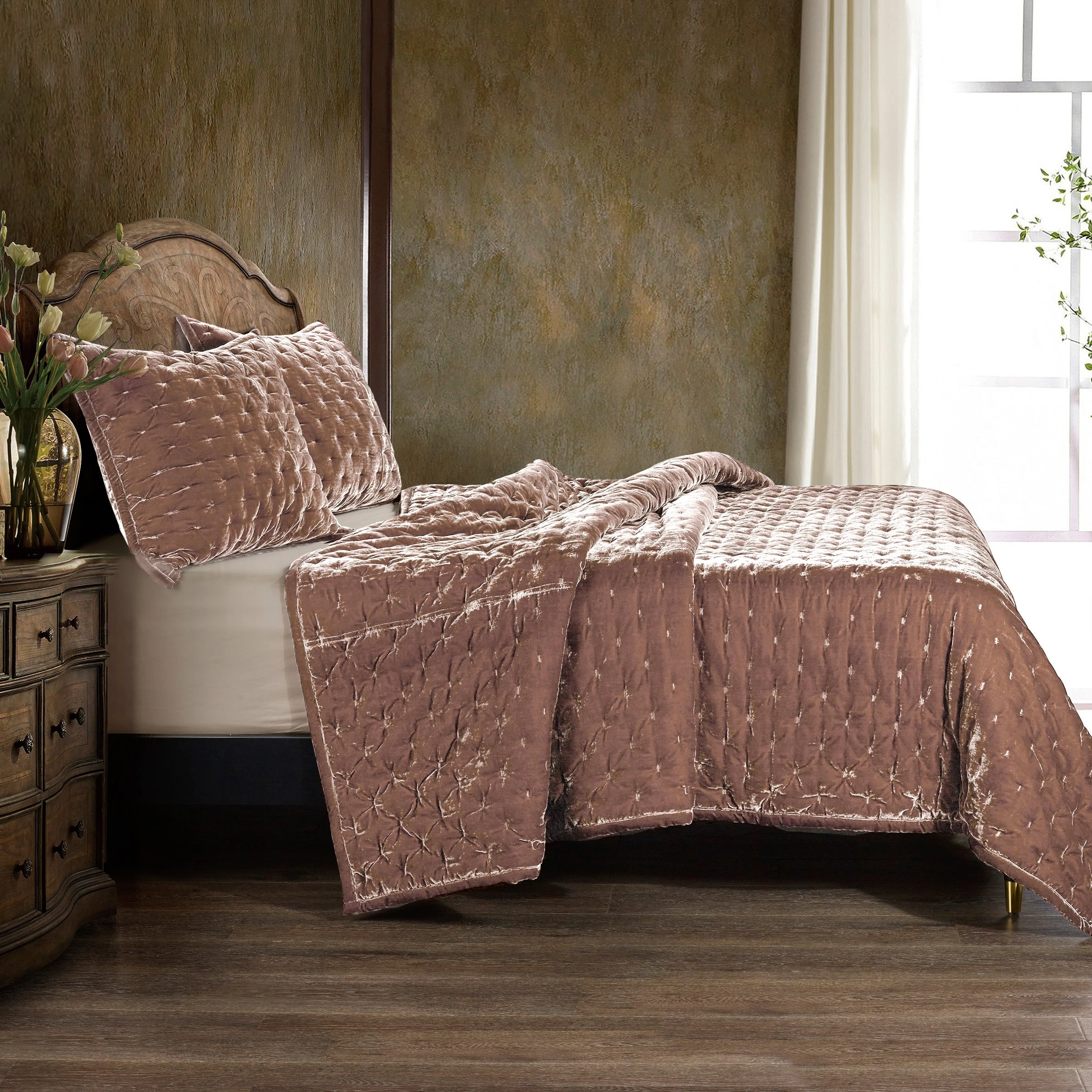 The Stella silk velvet quilt in neutral or rich jewel tones can be layered with other styles and colors in our Stella collection. The quilted texture shows off the silk velvet sheen. Create a modern, western, or traditional bed with coordinating accessories.