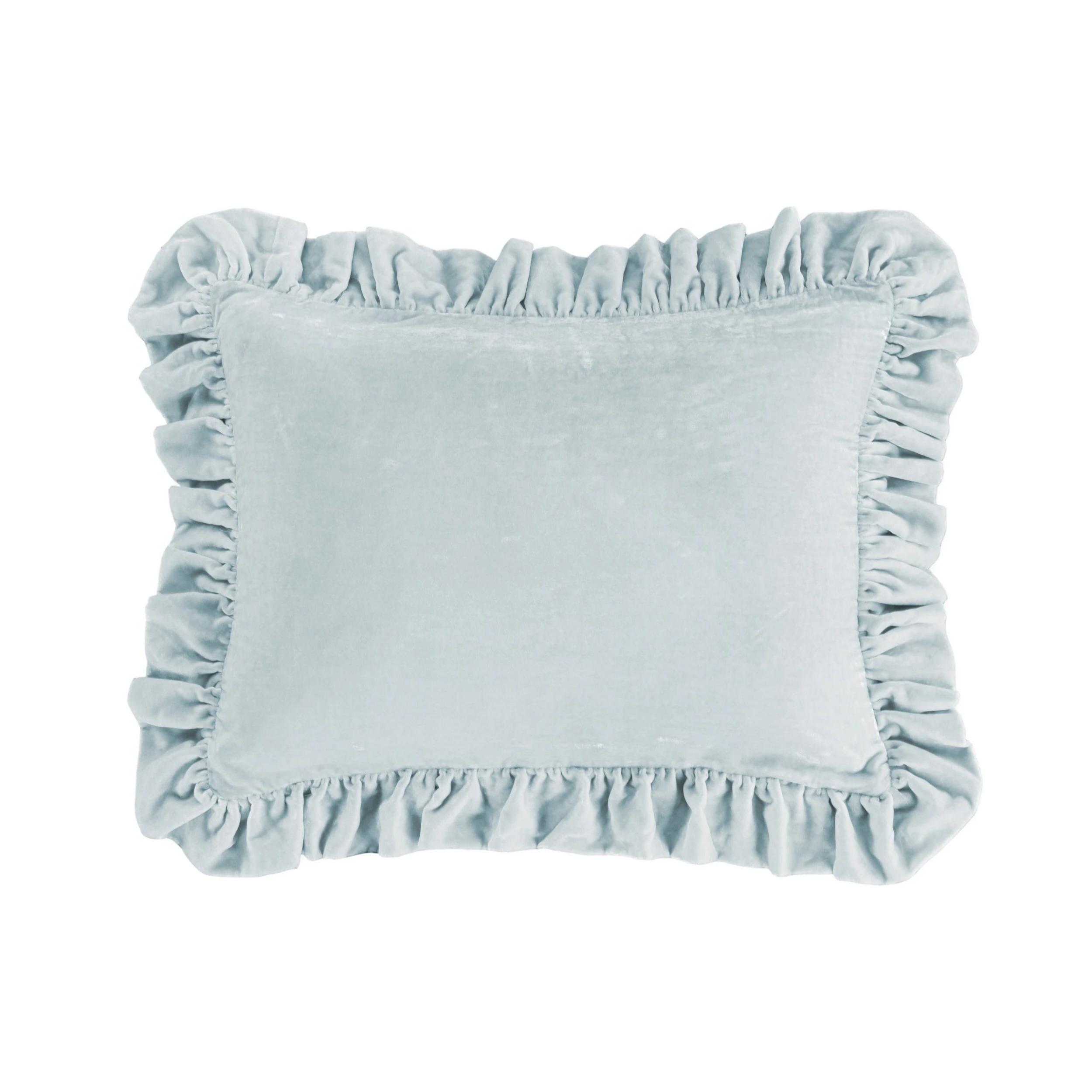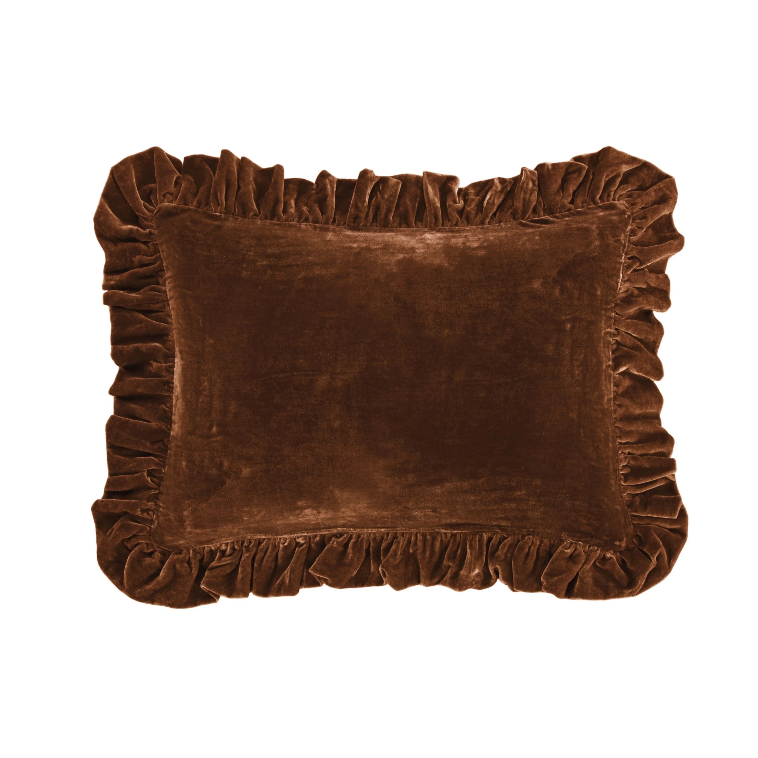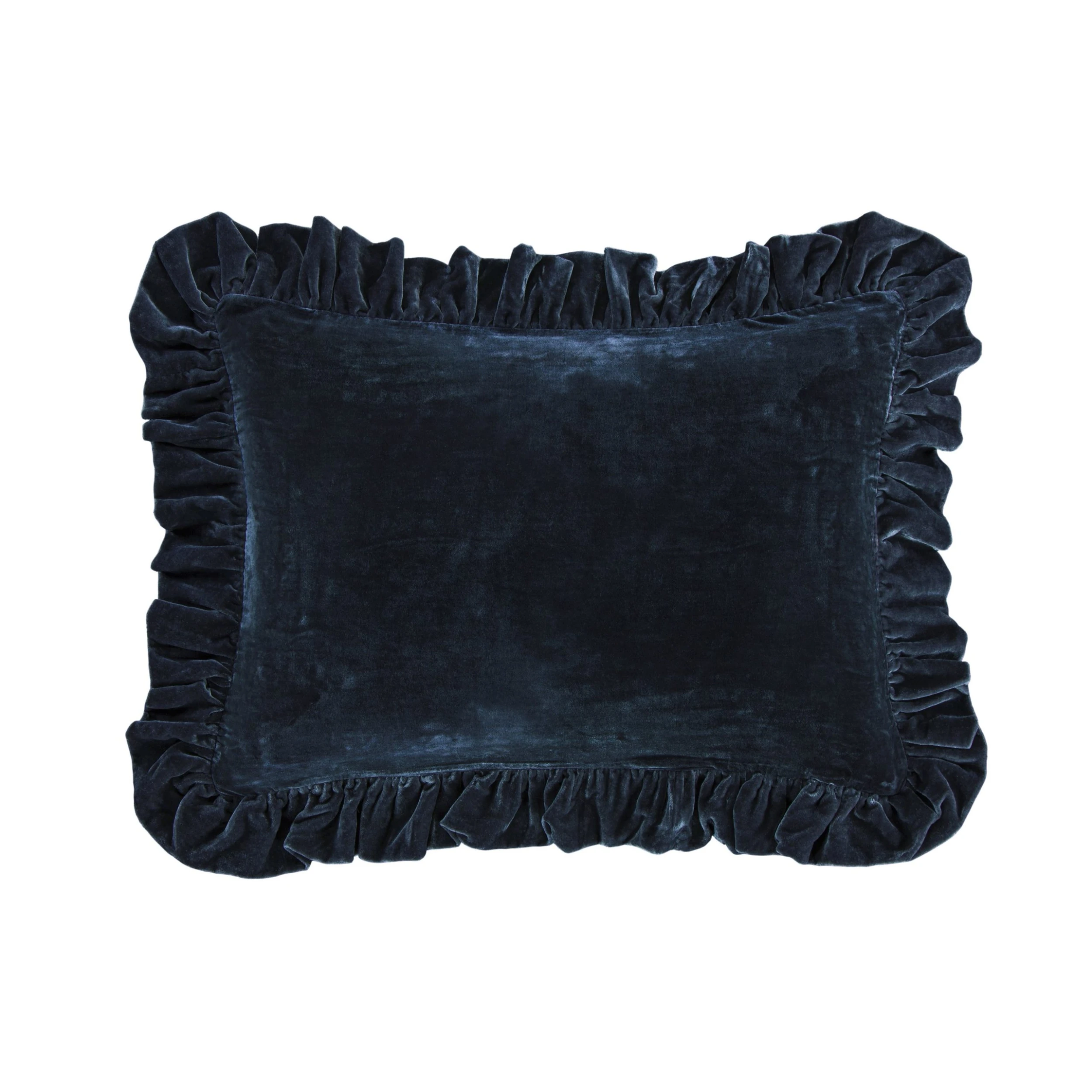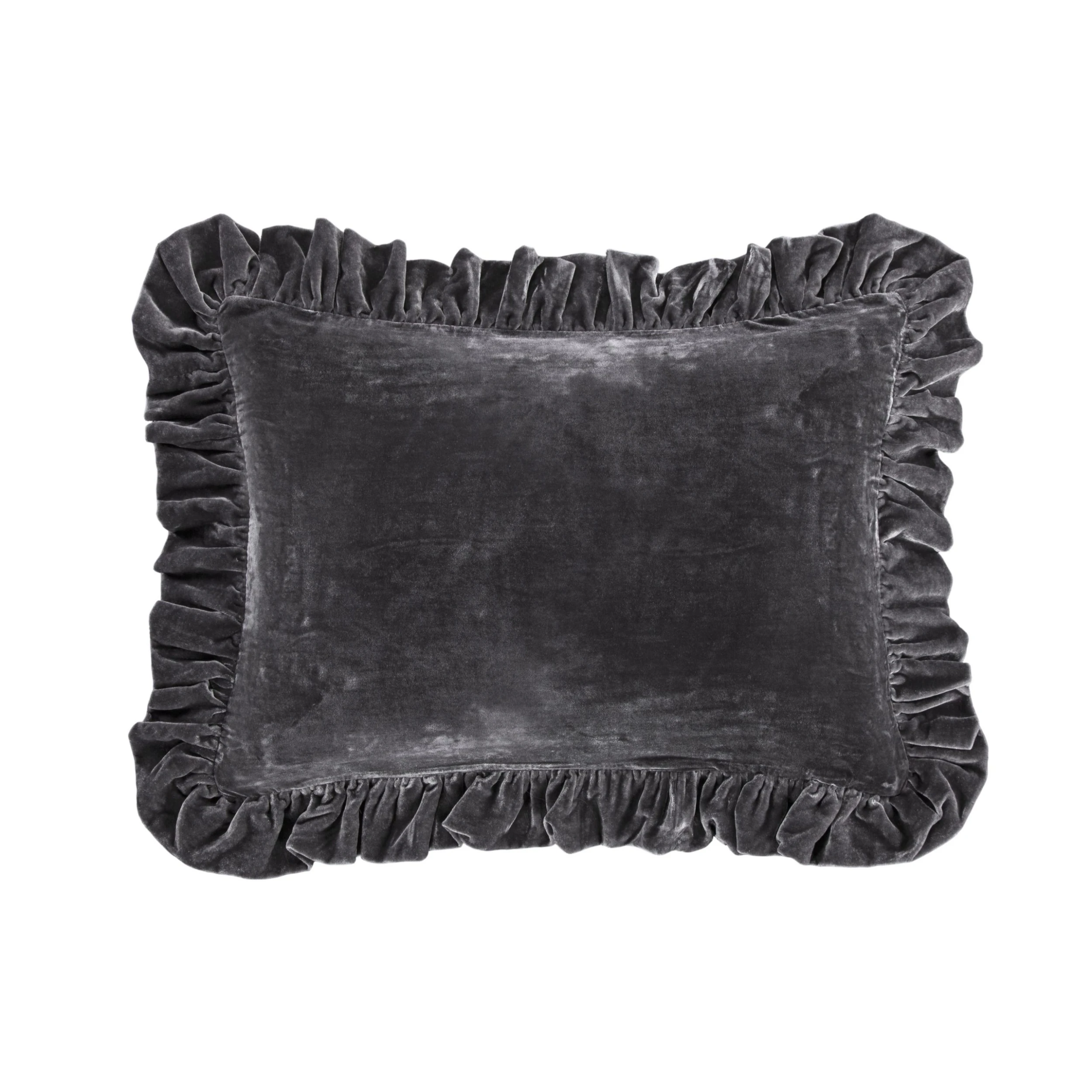Complete an elegant bedroom with this oblong pillow. Sumptuously soft to the touch, this pillow features a radiant gleam that imparts a luxurious and elevated look to any modern or traditional bedding, finished with ruffled edges for a charming yet sophisticated finish. Available in neutral and rich jewel tones to complement various styles and colors. Coordinate with other pieces in our Stella Collection to complete a dramatic and sophisticated traditional, Western or rustic bedroom look.