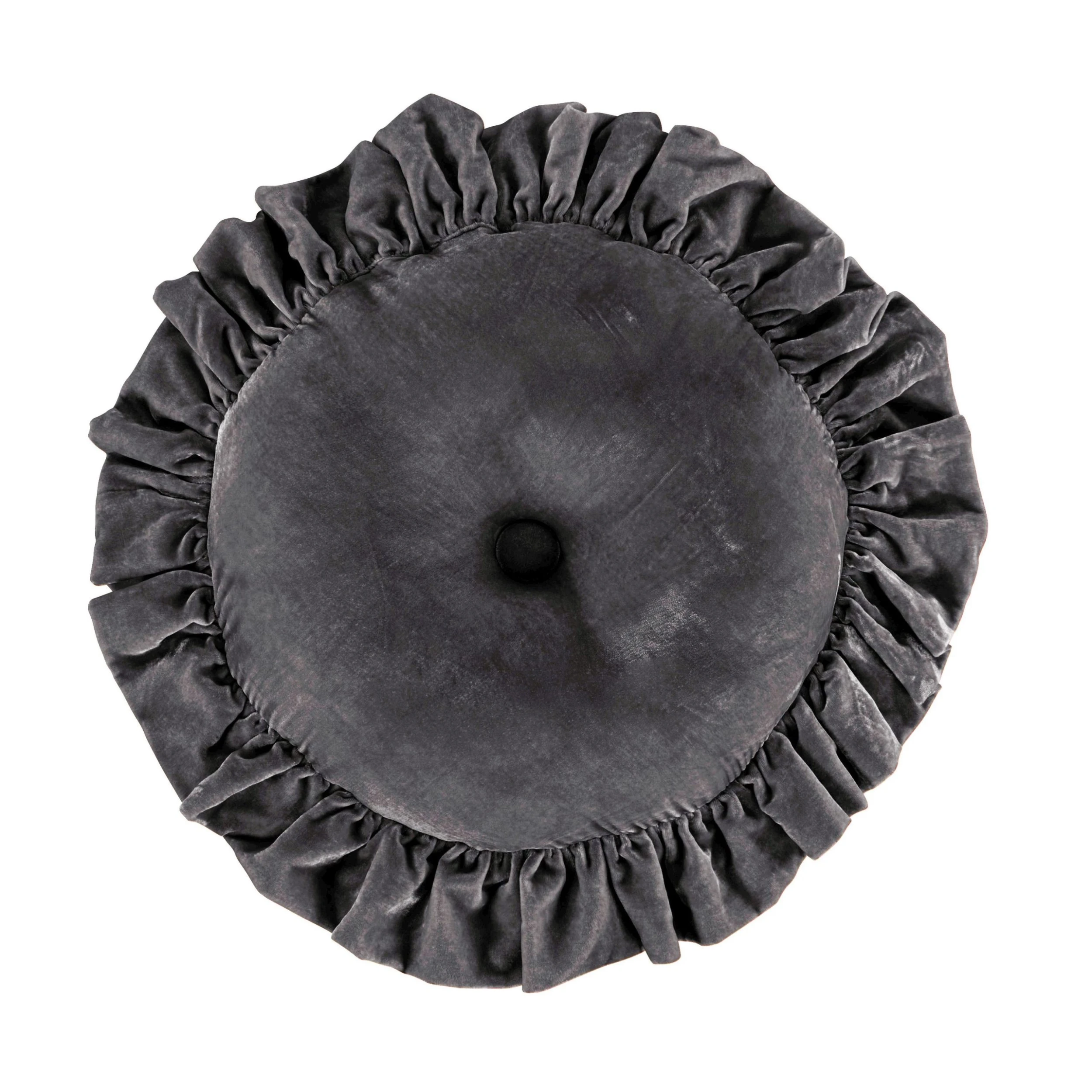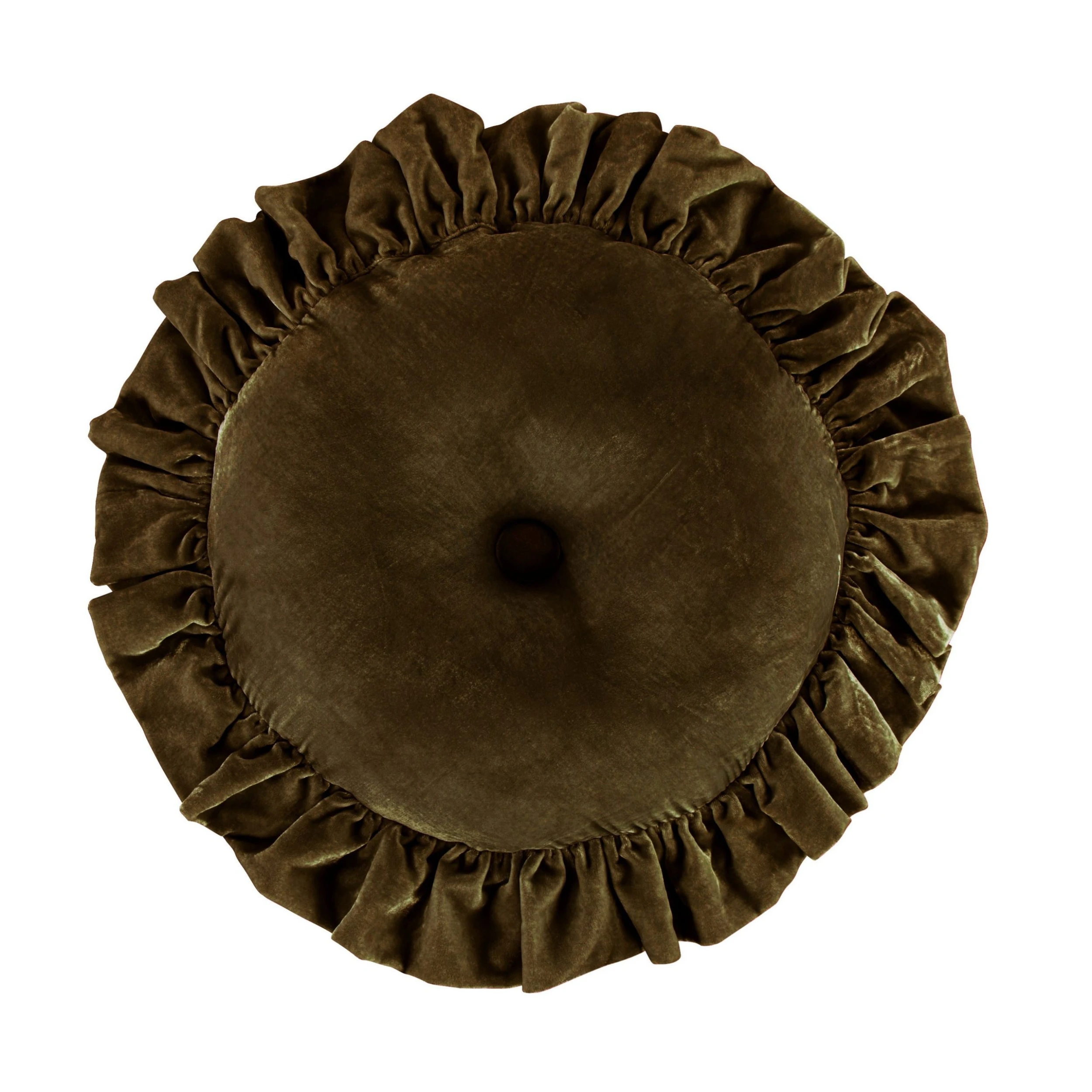Complete an elegant bedroom with this round pillow. Sumptuously soft to the touch, this pillow features a radiant gleam that imparts a luxurious and elevated look to any modern or traditional bedding, finished with ruffled edges for a charming yet sophisticated finish. Available in neutral and rich jewel tones to complement various styles and colors. Coordinate with other pieces in our Stella Collection to complete a dramatic and sophisticated traditional, Western or rustic bedroom look.