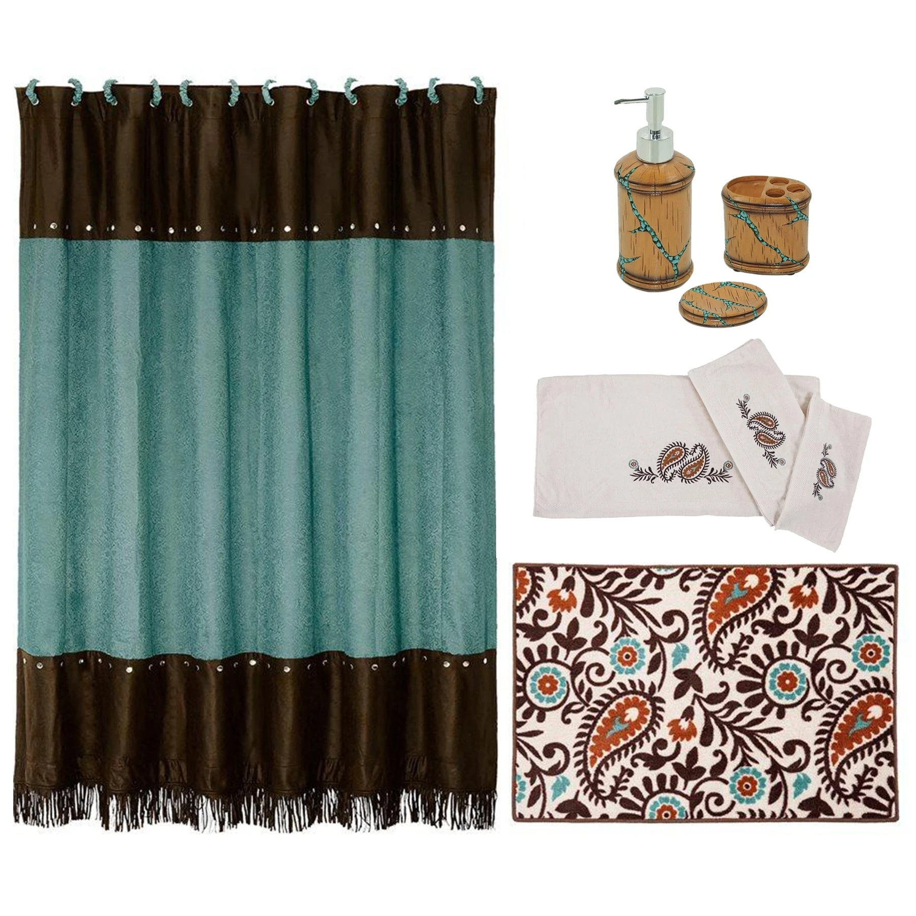 Add a southwestern flair to your bathroom with a cohesive collection set. This colorful Turquoise and Rebecca bathroom set provides you with ornate accessories that pull any bathroom together. Collection includes: Cheyenne Shower Curtain, 72″x72″ Turquoise 3 PC Turquoise Inlay Bath Set 3 PC Embroidered Rebecca Western Paisley Towel Set, White Rebecca Western Paisley Rug, 24″x36″