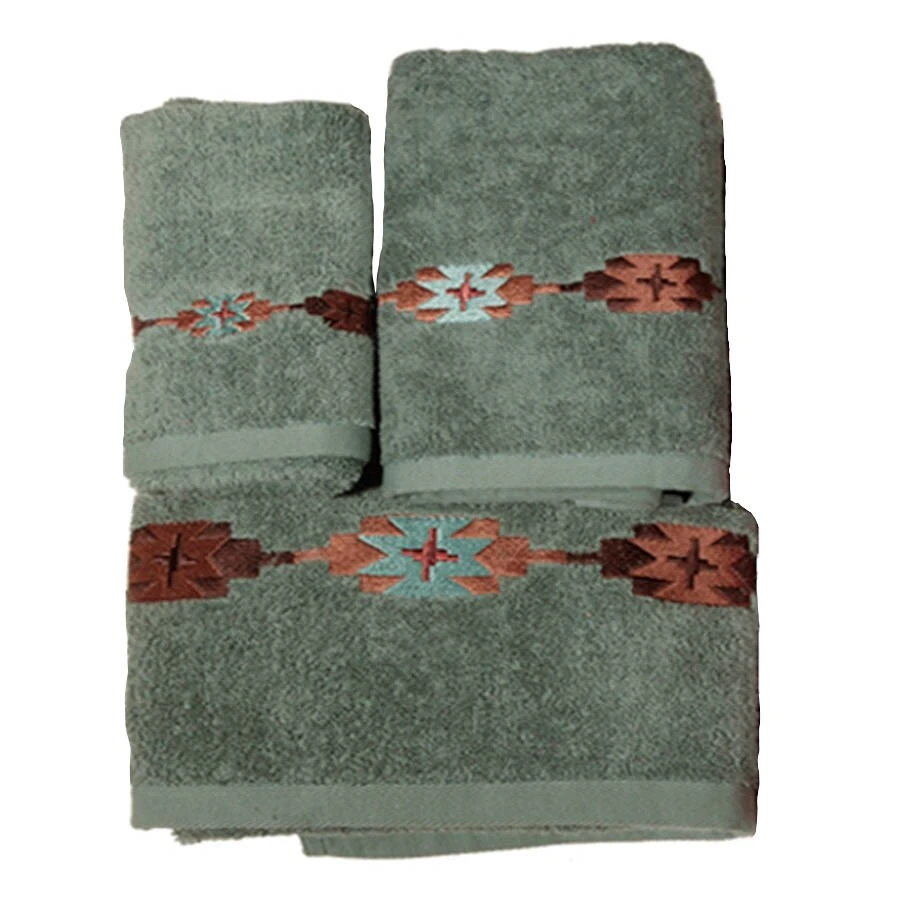 This set of 3 embroidered towels includes bath towel, hand towel and finger tip towel. These loop terry towel sets feature muted multicolored geometric embroidery detail. Also available in turquoise. Imported. Includes: (1) Bath Towel, (1) Hand Towel, (1) Finger Towel Measurement: Bath Towel – 27″x52″, Hand Towel – 16″x32″, Finger Towel – 13″x14″ Care: Machine wash warm, do not bleach, tumble dry low or dry clean recommended. Material: 100% Cotton (Exclusive of decoration)